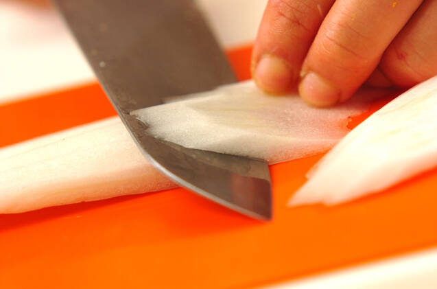 白菜は、葉の部分をザク切りにし、芯の部分は細い削ぎ切りにしてサッと水洗いしザルに上げる。