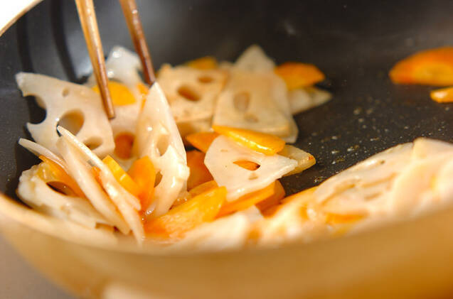 フライパンにゴマ油を入れて強火にかけ、レンコン、ニンジンを炒める。レンコンが少し透き通ってきたら<調味料>の材料を加える。