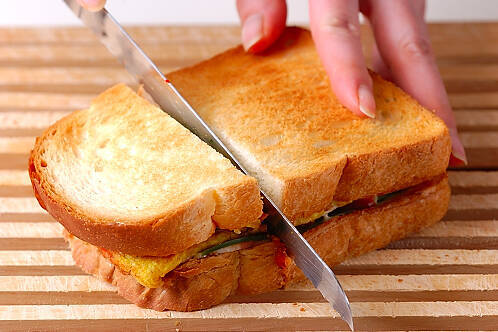 バター、練りカラシ、マヨネーズを塗ったもう一枚のパンではさみ、乾いたキッチンペーパー又は布巾で包んで少しなじませ、食べやすい大きさにカットする。