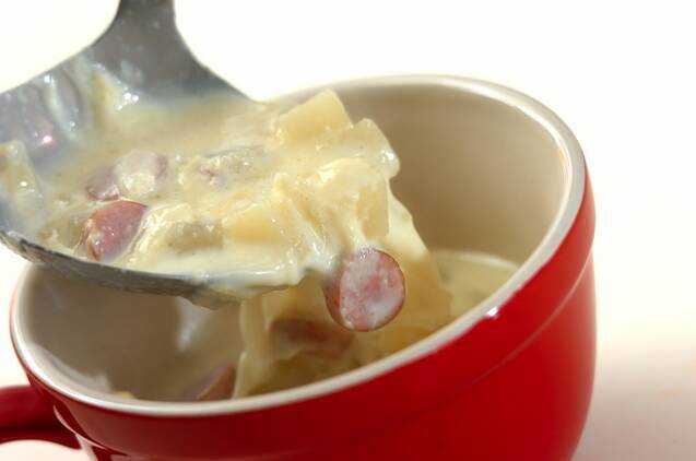 <スープ>の材料を加え、ジャガイモが柔らかくなるまで煮る。器に注ぎ入れ、粗びき黒コショウを振る。