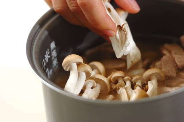 炊飯器に洗い米と<調味料>を入れ、さらに通常に炊く水量線まで分量外の水を加える。豚バラ肉とシメジをお米を覆うようにのせ、普通に炊飯する。