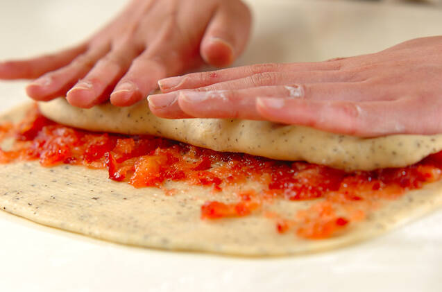 手前から巻いていき、巻き終わりをしっかりつなぎあわせたら、5等分に切る。