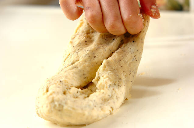 生地がつながってきたら無塩バターを加え、さらによく混ぜる。生地がまとまってきたら、台にたたきつけるようにしながらこね、生地を引っ張ってみても切れず薄くのびるようになるまで繰り返す。