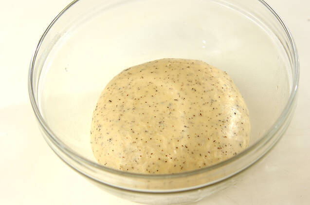 表面に張りをもたせるように丸め、ボウルに入れてラップをかける。温かい所やオーブンの発酵機能を使い一次発酵させる(約60分)。