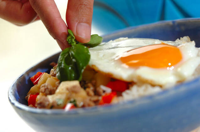 器にご飯を盛り、(3)、(4)をのせる。取り分けておいたバジルを飾る。