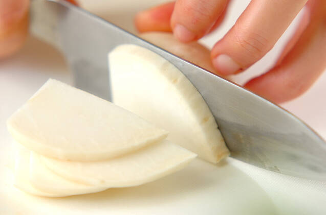 カブは皮つきのままきれいに洗い、縦半分に切ってさらに厚さ5~6mmの半月切りにする。
