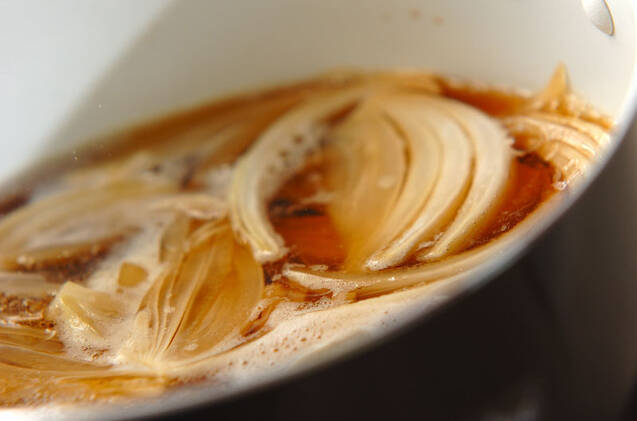 麺つゆにかけつゆの配合で水を合わせて800mlにし、鍋に入れて中火~強火にかける。新玉ネギを薄いくし切りにして加え、軽く煮る。