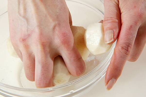 里芋は皮をむき、大きい物は一口大に切る。塩をもむようにからめてヌメリを取り、水洗いする。