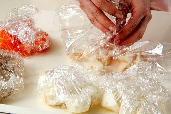 ゴボウはザルに上げ、里芋、レンコン、大根、ニンジンは各々水でぬらして、ラップで包む。電子レンジに7~8分かけ、水に取りザルに上げる。
