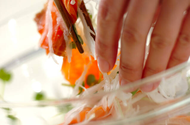 ボウルに新玉ネギ、貝われ菜、スモークサーモンを入れ、ふんわりと混ぜ合わせる。