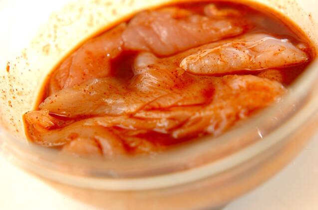 鶏ささ身は筋を引いて、厚みを半分に切って1枚に開き、合わせた<下味>の材料につけて10分置く。