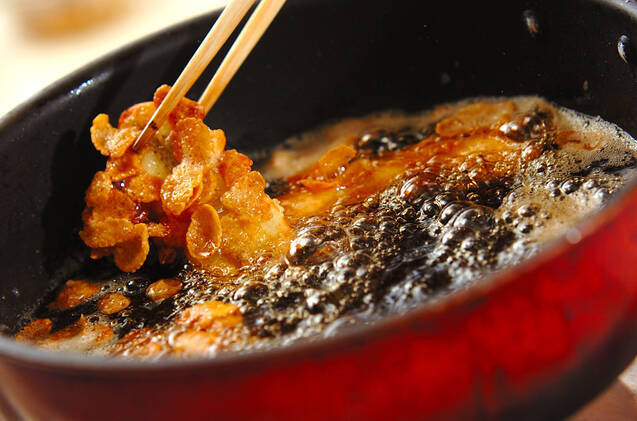 バナナに<衣>の片栗粉を薄く振り、溶き卵を通してコーンフレークを全体にからめる。揚げ油にそっと入れ、おいしそうなキツネ色にサックリ揚げる。器に盛り、粉糖を振る。