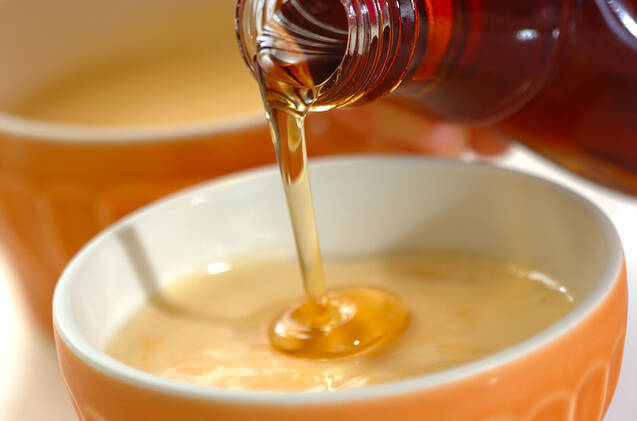 トロミがついたら、生クリーム、バニラエッセンスを加えて混ぜ合わせる。器に流し入れ、1時間以上冷蔵庫で冷やしかためる。かたまったら、メープルシロップをかける。