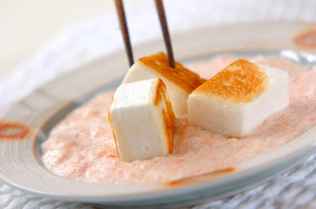器に<トロロ明太子>をしきハンペンをのせ、青のりを振る。