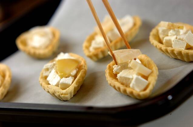 (3)のタルトに(5)、フェタチーズをのせてオーブンシートを敷いた天板の上に乗せて200℃に予熱したオーブンで10分ほど焼く。仕上げに細ネギをのせる。