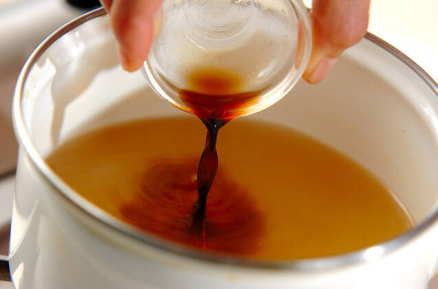 鍋に<スープ>の材料を入れて中火にかけ、固形チキンスープの素が溶けたら、塩、薄口しょうゆで少し濃いめに味を調える。