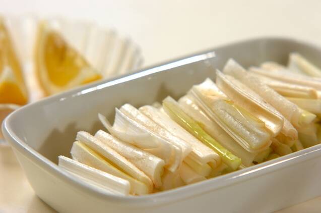 白ネギは長さ5cmに切ってさらに縦4等分に切り、塩とゴマ油をからめる。レモンは半分に切る。