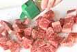 ステーキ肉は一口大に切り、塩コショウ、ガーリックパウダーを全体にかける。