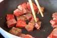 フライパンに薄くサラダ油をひき、強火にかけ一口大に切ったステーキ肉の表面全体に焼き色がつくくらい、手早く炒め、いったん取り出す。