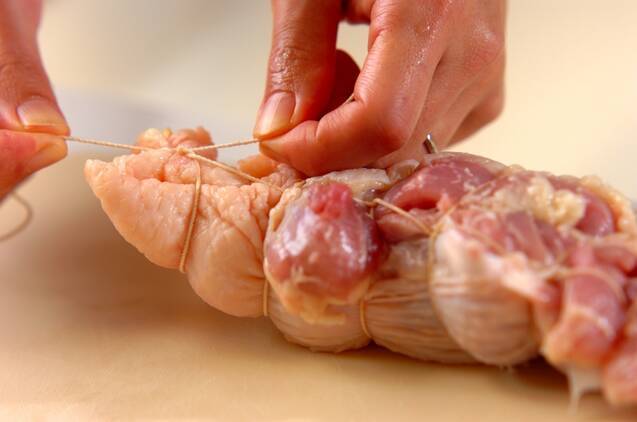 鶏もも肉は皮目を外側にして巻き、ほどけないようにしっかりとタコ糸でしばる。