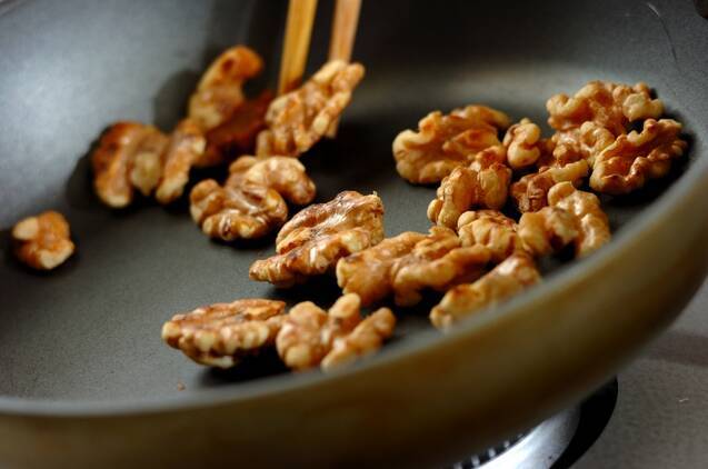 <和え衣>のクルミはフライパンで香ばしく煎り、ザク切りにする。