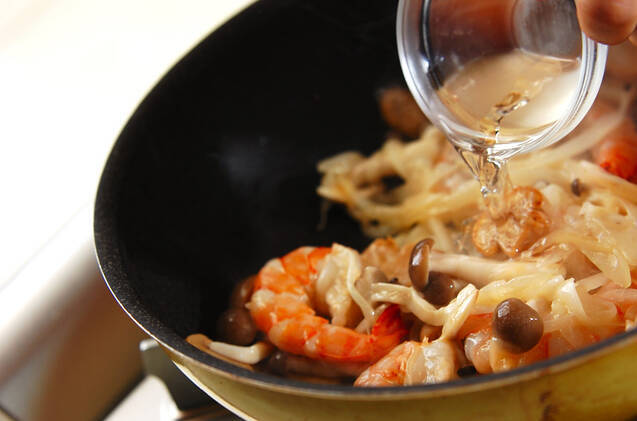 フライパンにバターを熱し、玉ネギ、シメジ、マッシュルームを炒めて全体にしんなりしたら、エビを加えて炒め合わせ、<調味料>の材料を加える。