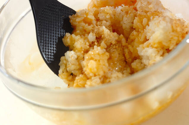 卵は溶いて薄口しょうゆを加え、ご飯、すり白ゴマを加えて混ぜ合わせ、茶碗によそう。