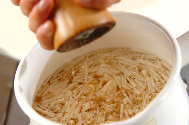 煮たったら豆腐を加え、塩コショウで味を調える。ワカメを加えて火を止め、器によそう。