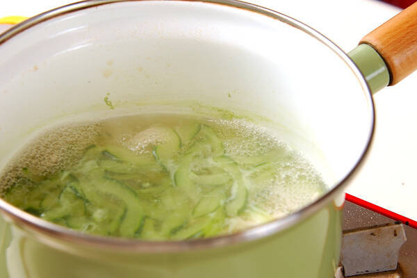 鍋にだし汁、キュウリを入れて強火にかけ、煮立ったら鶏ささ身を加え、ひと煮立ちしたら、火を弱めてキュウリが半透明になり、しんなりするまで約7~8分煮る。