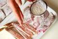 舌平目はウロコをこそげて内臓を出し、2~3つに切り、鯛、ホタテ貝柱、カニと共に塩コショウし、薄く小麦粉をつける。