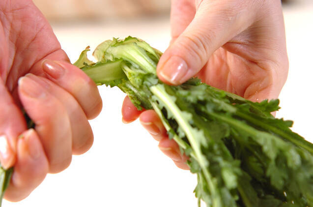 菊菜は軸から葉を摘み取り水洗いして、5cmの長さに切る。