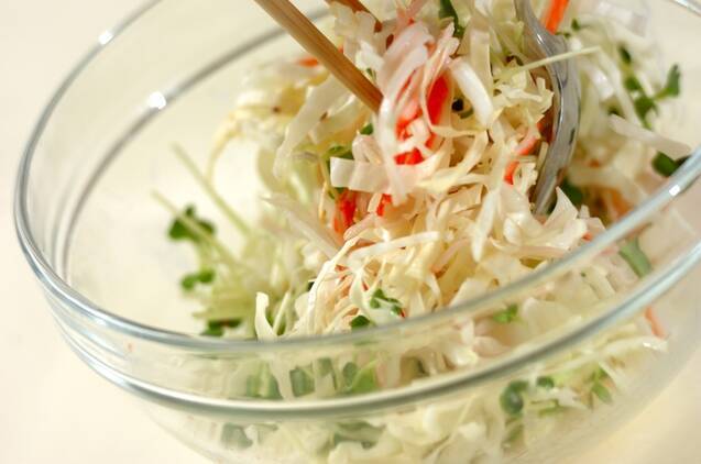 <ドレッシング>のボウルにキャベツ、カニ風味カマボコ、貝われ菜を加えて和え、器に盛る。