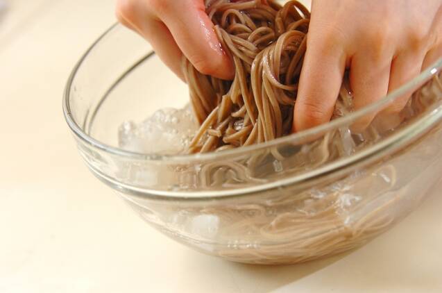 そばはたっぷりのお湯で指示通りにゆで、冷水で水洗いする。しっかりと水気をきって盛り付ける。刻みのりを上にのせ、刻みネギを添える。