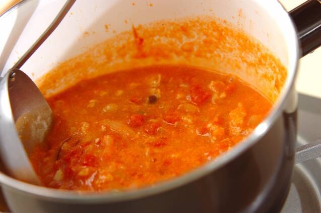 煮たったら火を弱め、少しトロミがつくまで煮込んで火を止める。塩コショウで味を調えて器に注ぎ、ドライパセリを振る。