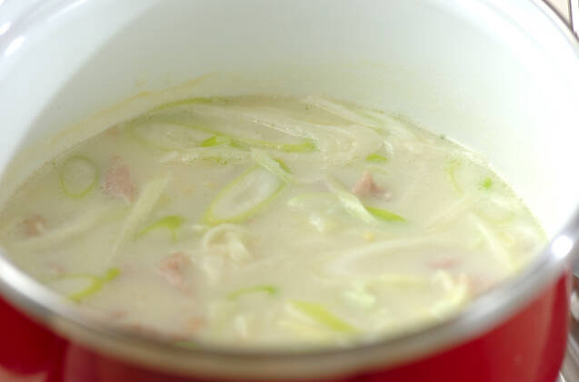 鍋に<スープ>の材料を入れて火にかけ、軽く煮たったら鶏もも肉、白ネギ、ショウガを入れ、中火で4~5分煮て塩で味を調える。
