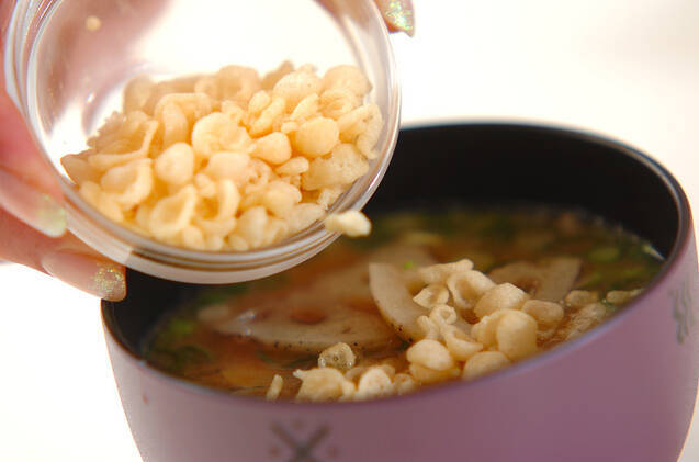 みそを溶き入れ、刻みネギを加えてひと混ぜし火を止める。器に注ぎ分けて天かすを加え、お好みで粉山椒を振る。