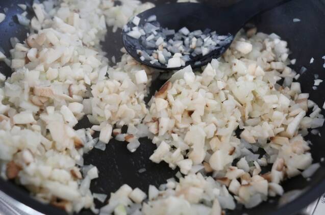 エリンギを加えて全体を炒めたら、豚ひき肉を入れ、ほぐしながら色が変わるくらいまで炒める。
