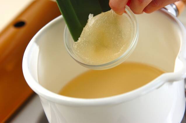 鍋にリンゴ酢、グラニュー糖を入れて火にかける。グラニュー糖が溶けたら火を止め、ふやかしたゼラチンを加えて余熱で溶かす。