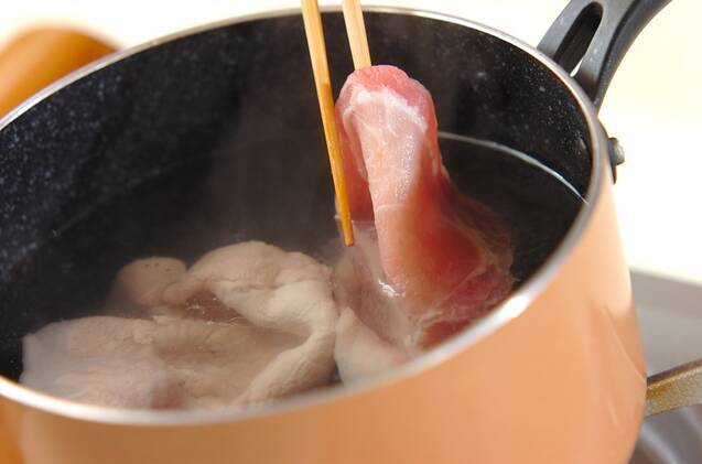 鍋に湯を沸かし、ニンジンをさっとゆで取り出す。その湯で豚薄切り肉をゆで、水に放ち、ザルにあげて水気をきっておく。