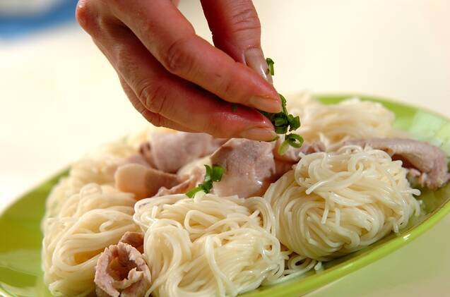 別の器に素麺、ゆでて食べやすい大きさに切った豚肉をのせ、万能ネギを散らす。<麺つゆジュレ>を沿え、素麺や豚薄切り肉を入れ、ジュレにからめていただく。