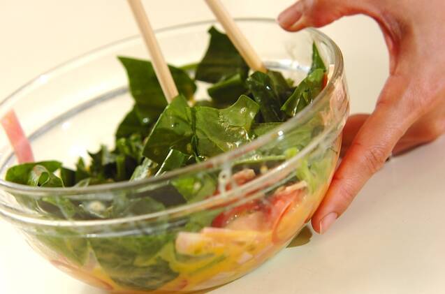 卵を割ってボウルに入れ、オリーブ油以外の材料をすべて加え混ぜる。