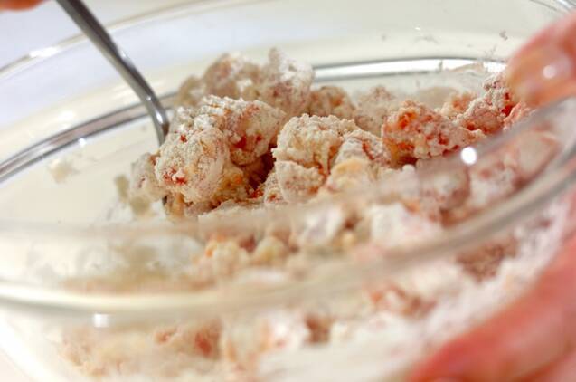 ボウルにトマト、塩、オレガノを混ぜ、ホットケーキミックスを加えて混ぜ合わせる。