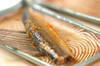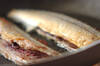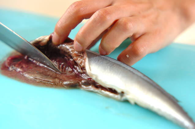 サンマは頭と尾を切り落とし、腹に切り込みを入れてワタを取り出す。全体をきれいに水洗いして水気をしっかり拭き取り、全体に塩をまぶす。