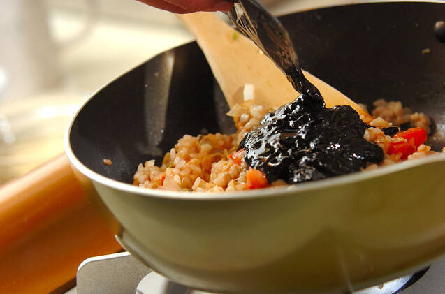 イカスミソースを加え、全体に混ざったら白ワイン、半量の<スープ>を加え、全体によく混ぜ合わせる。