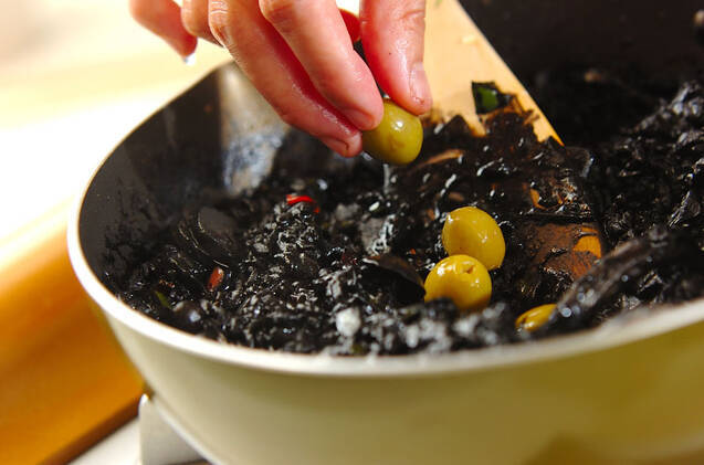 蓋をして弱火で水分がなくなるまで約10~15分煮て蓋を取り、火を強くして1~2分加熱する。余分な水分が飛んだらグリーンオリーブを散らしてレモンを添える。