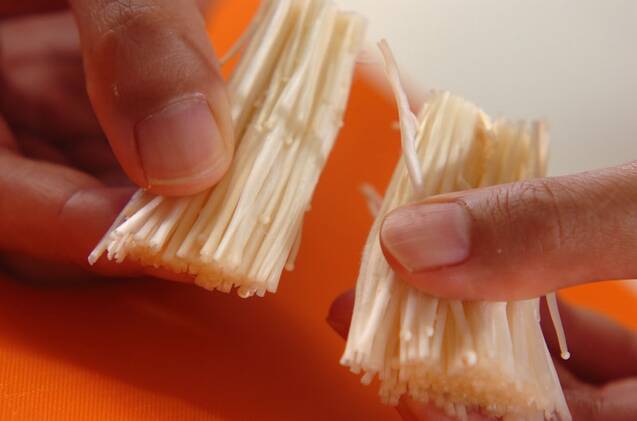 エノキは根元を切り落として、長さを半分に切る。根元をほぐす。