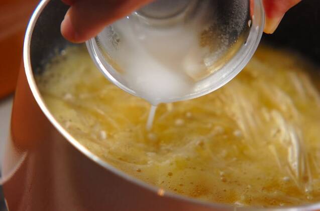 沸騰したら<水溶き片栗>をまわし入れて、トロミをつける。