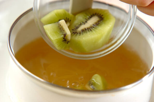 鍋底を水につけ、粗熱が取れたら白ワイン、レモン汁を加え、トロミがついてきたらキウイ、グレープフルーツを加えて手早く混ぜ合わせる。