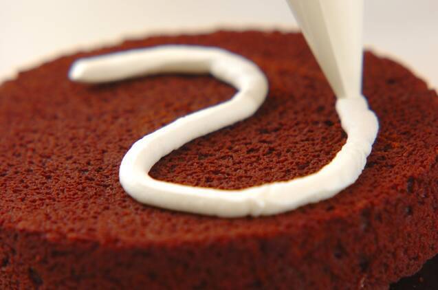 <飾り>の生クリームを8分立てに泡立て、絞り袋に入れる。絞り袋の口を幅1cmに切る。生クリームをおばけの形になるように絞り、チョコペンで顔を描く。