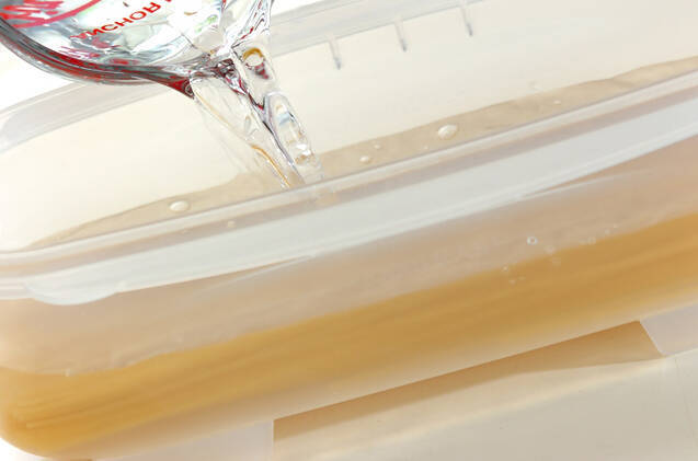 スパゲティーはレンジ用パスタゆで容器に入れ、指定量の水を加える。容器の蓋をしないで電子レンジで普通にゆでる時間+4分30秒長く加熱する(ここでは11分ゆでています)。